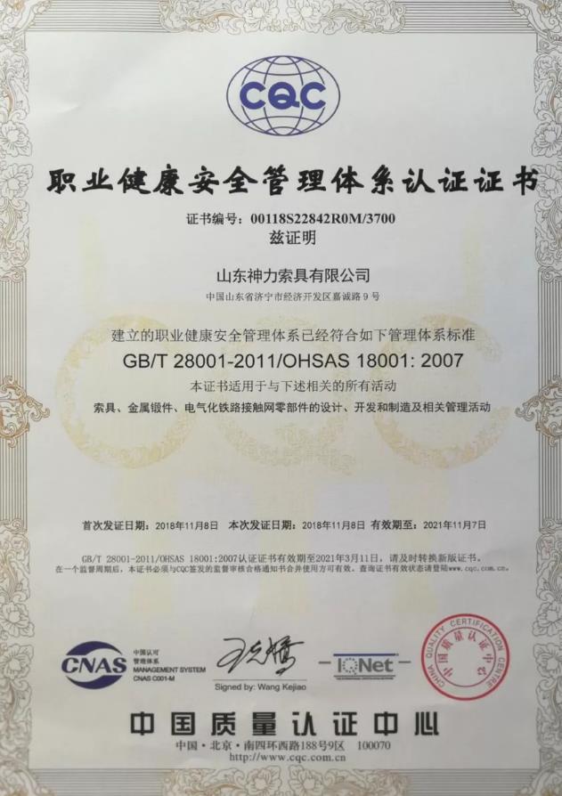 职业健康安全管理体系证书